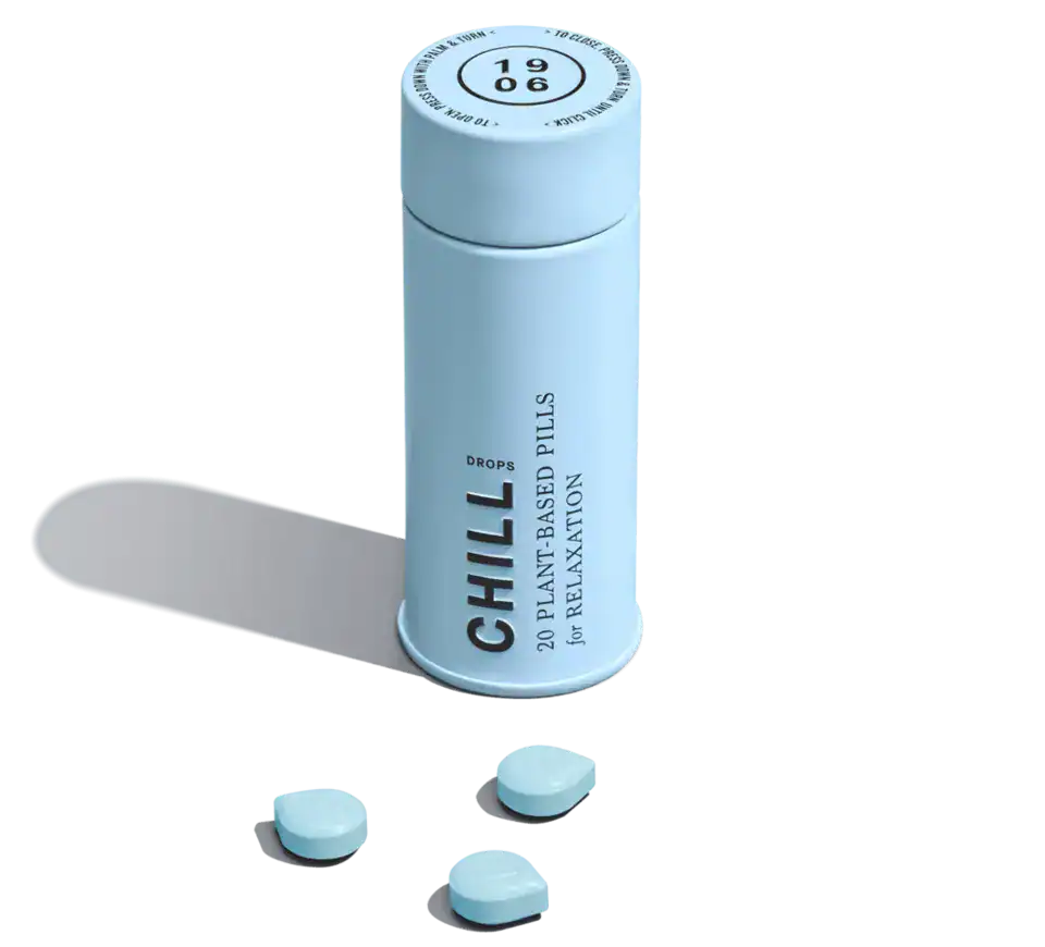 100mg THC/500mg CBD 20pk Description Find peace of mind and calm the body with a blend of two cannabinoids (THC & CBD) and plant medicines Magnolia and L-Theanine. Chill is the only 1906 Drop formulated with a high dose of CBD: When paired with THC and plant medicines reduces stress, releases tension, and relaxes without losing focus or function. — Swallowable pills with a rapid onset of 20 minutes. Vegan, calorie-free, sugar-free, and gluten-free. Each Chill Drop contains 5mg THC and 25mg CBD.