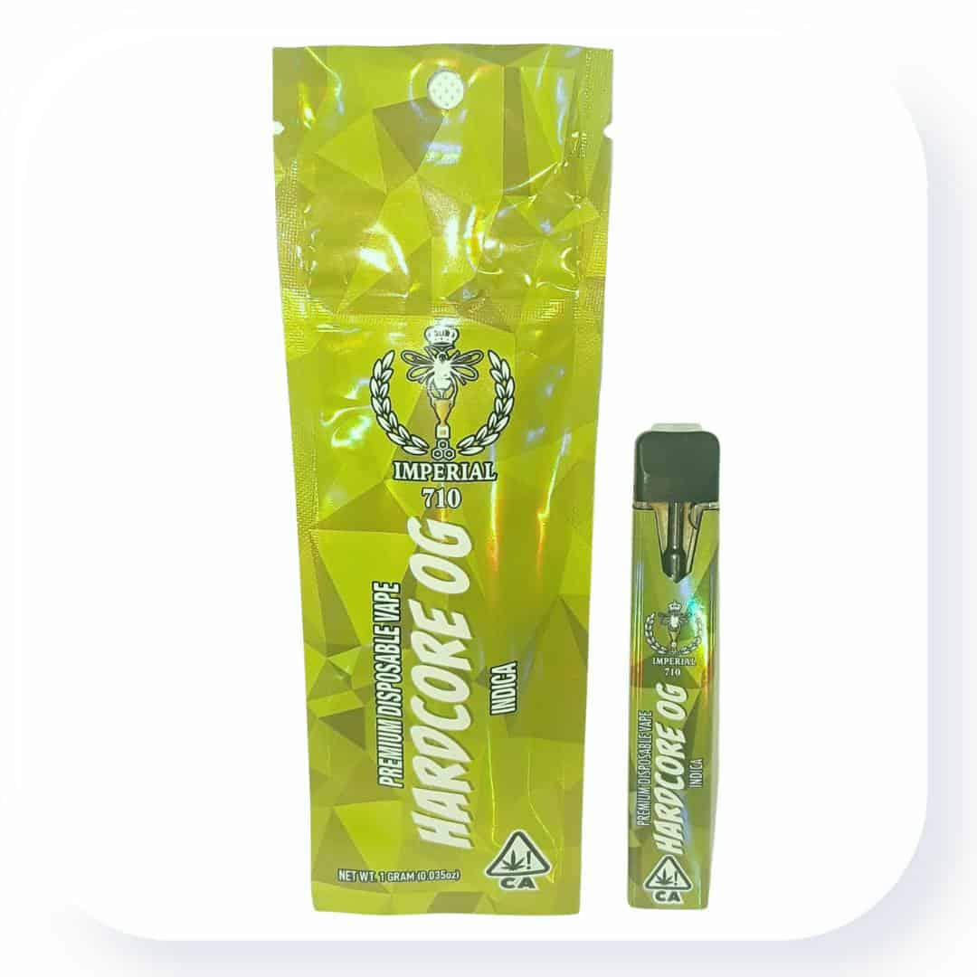 Hardcore Og in a PREMIUM RECHARGEABLE DISPOSABLE VAPE by Imperial Extracts (1.0 g PREMIUM DISPOSABLE VAPE) – THC 87.00%, Hardcore OG is a California strain. Its dense, pungent buds produce thick coats of resin that can be extracted for potent (and we mean potent) concentrates. This potent indica cannabis strain, is known to have a delightful taste and aroma of herbal honeyed tea that’s deliciously danky.