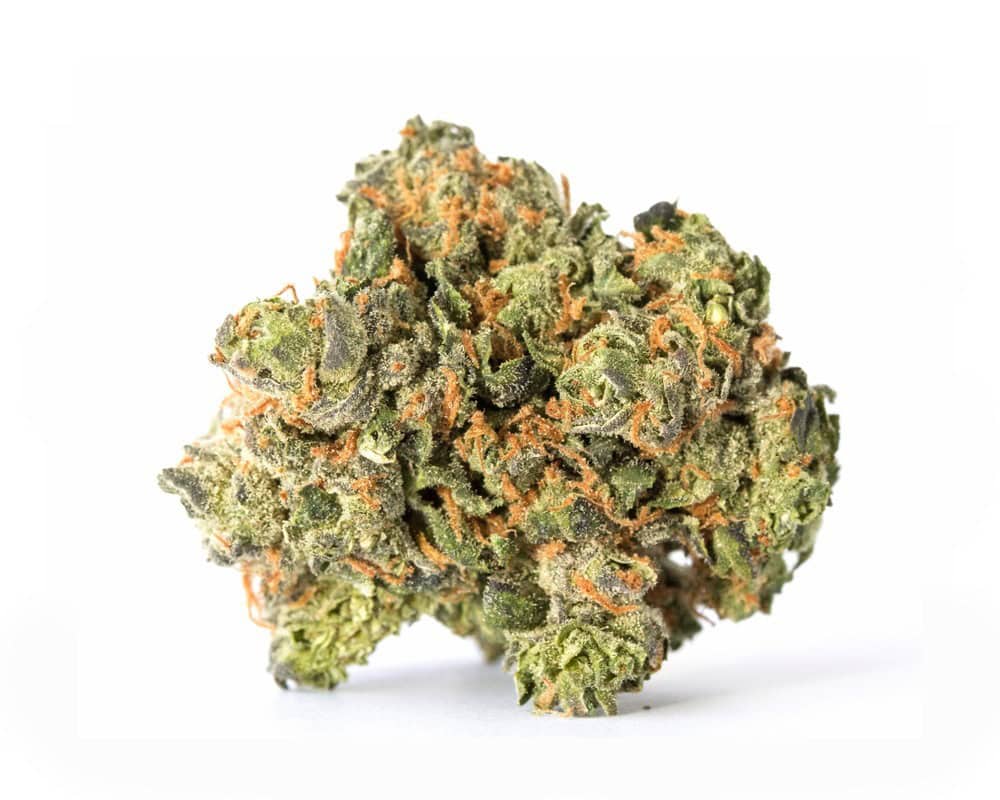 Runtz is an evenly balanced hybrid strain (50% indica/50% sativa) created through a delicious cross of the infamous Zkittlez X Gelato strains. Named for the iconic candy, Runtz brings on a super delicious fruity flavor with tropical citrus and sour berries galore. The aroma is very similar, although with a sharp spicy pineapple effect that turns slightly pungent as the sticky little nugs are broken apart and burned. The Runtz high comes roaring in a few minutes after your final toke, first hitting your head with a calming lift before spreading its tingly tendrils throughout the rest of your body. As the Runtz high expands, you’ll begin to feel a deeply calming effect spread through your limbs, leaving you totally sedated and couch-locked, immovable for hours and hours on end before you finally fall into a deep and peaceful sleep. Thanks to these effects and its super high 19-29% average THC level, Runtz is often said to be perfect for treating conditions such as insomnia, chronic pain, appetite loss or nausea and chronic stress or anxiety. This bud has dense grape-shaped olive green nugs with thin orange hairs, dark purple undertones and a coating of frosty tiny white purple-tinted crystal trichomes.